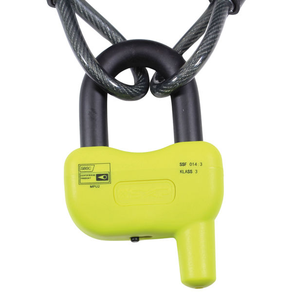 Leveres komplett med en stor og solid bøylelås i en lett synlig farge og 3 meter plastbelagt, herdet stålwire med løkker i begge ender.