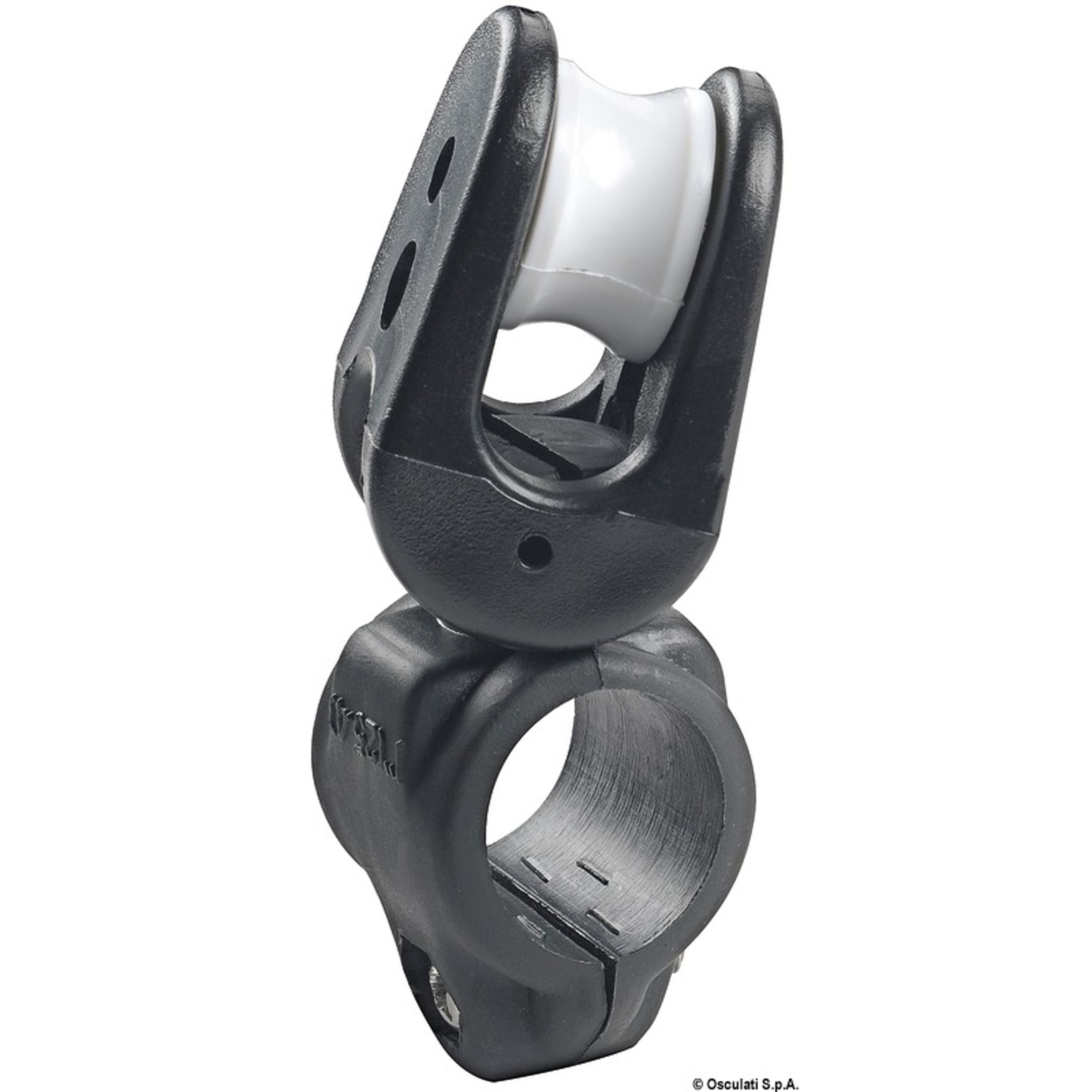Rekkverksblokk for forstagsrulle/furler. Laget i nylon med 24 mm skive som passer for tau opp til 10 mm. Leddet for å kunne tilpasses riktig vinkel på båten. Festes på en 25 mm rekkverksstøtte.