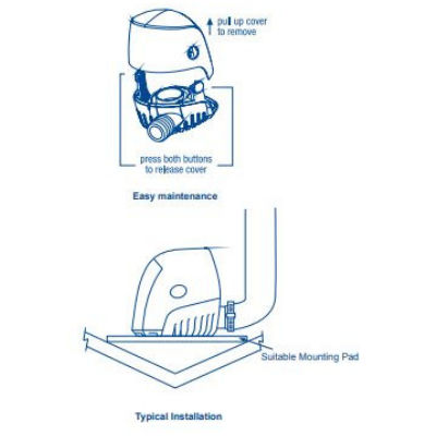 Starter automatisk når vannivået når 57mm rundt pumpen og slår seg av ved 17mm. Pumpen er enkel å åpne for rengjøring. ISO8849.