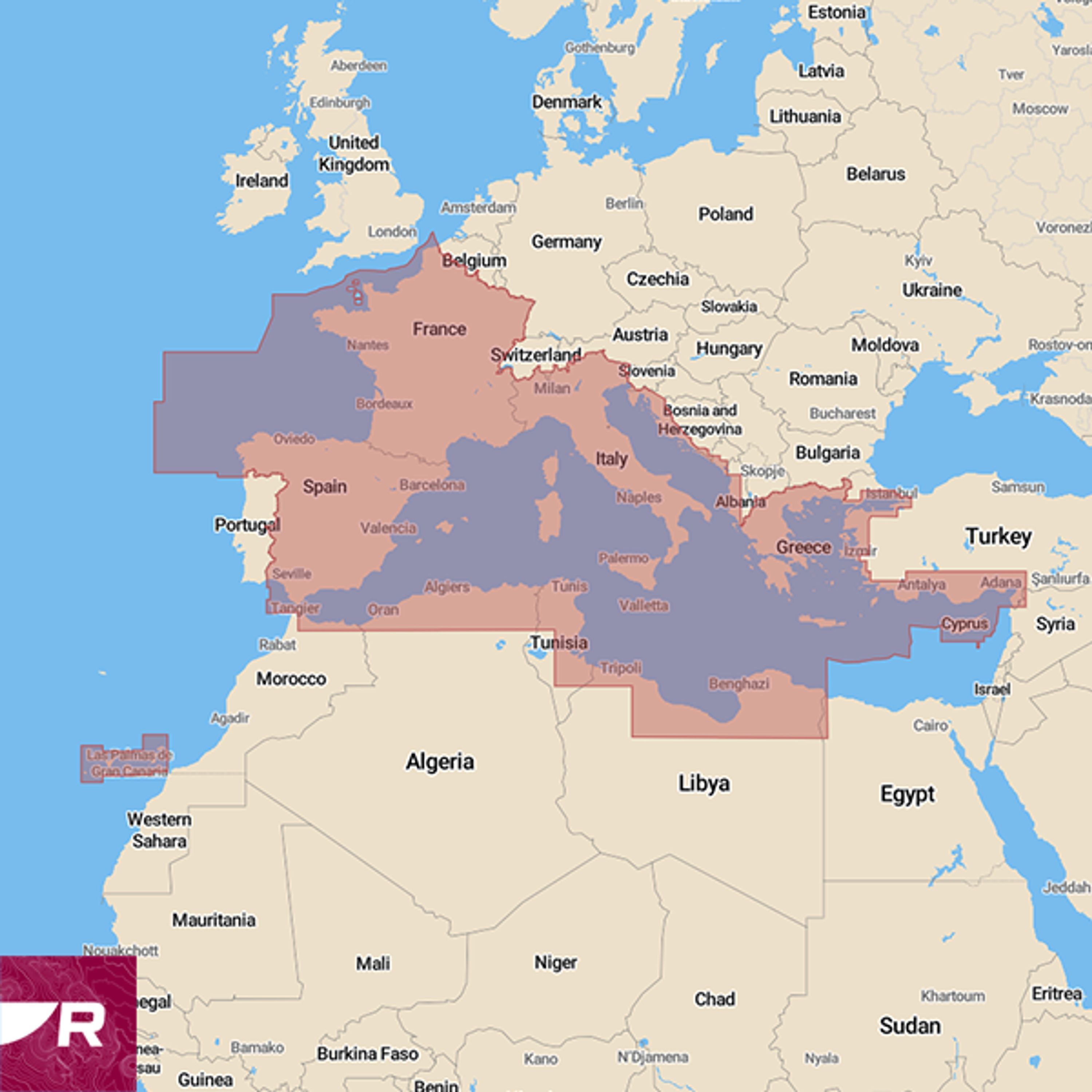 LightHouse Charts Mediterranean omfatter Spania, Frankrike, Italia, Malta, Kroatia, Slovenia, Montenegro og Hellas.